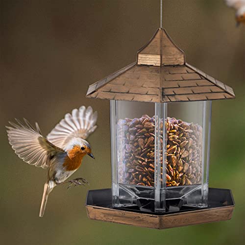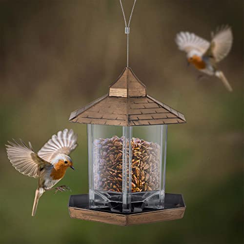 𝐆𝐥𝐨𝐁𝐫𝐢𝐭𝐞 presents an eye-catching bird feeder that is made of durable and environmentally friendly and heavy-duty plastic material for long-lasting use. The feeder will hold up in the harshest weather. With its hexagon shape, the bird feeder features an inclined roof to shade birds from the sun and rain. When the seeds are eaten, more seeds will naturally fill the tray. It holds up to 2.15 lb of seeds. It could be filled with a variety of seeds to attract birds, such as black oil sunflower seeds, safflower seeds to attract red finches, tits, house finches, birds, blue birds, warblers, starlings and more. The bird feeder is equipped with a twist-lock cover to keep the lid safely closed and the seeds are fresh and dry inside. The clear panels make it easy to inspect seed levels. When it comes to refilling, just turn to unlock, lift the lid up and pour seed. This bird feeder is a perfect gift idea for a friend or loved one with a fondness for wildlife and nature. It can be hung in homes, garden decorations, terraces, backyards, front porches and other outdoor places. Comes fully assembled and ready to hang.