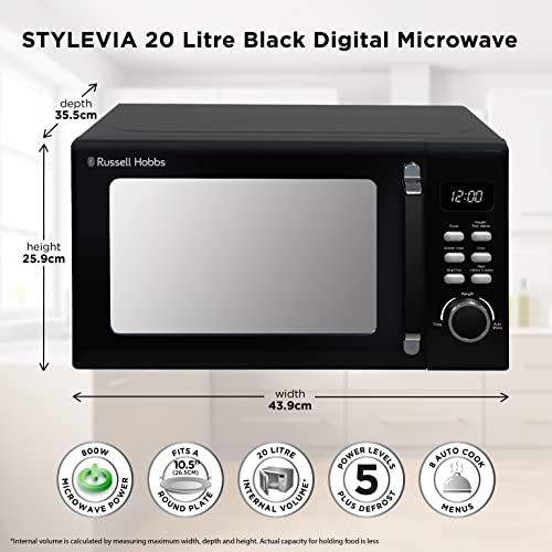 Specification: Russell Hobbs RHM2026B STYLEVIA 20 Litre 800 W Black Digital Microwave, 5 Power Levels, Mirror Finish, 8 Auto Cook…